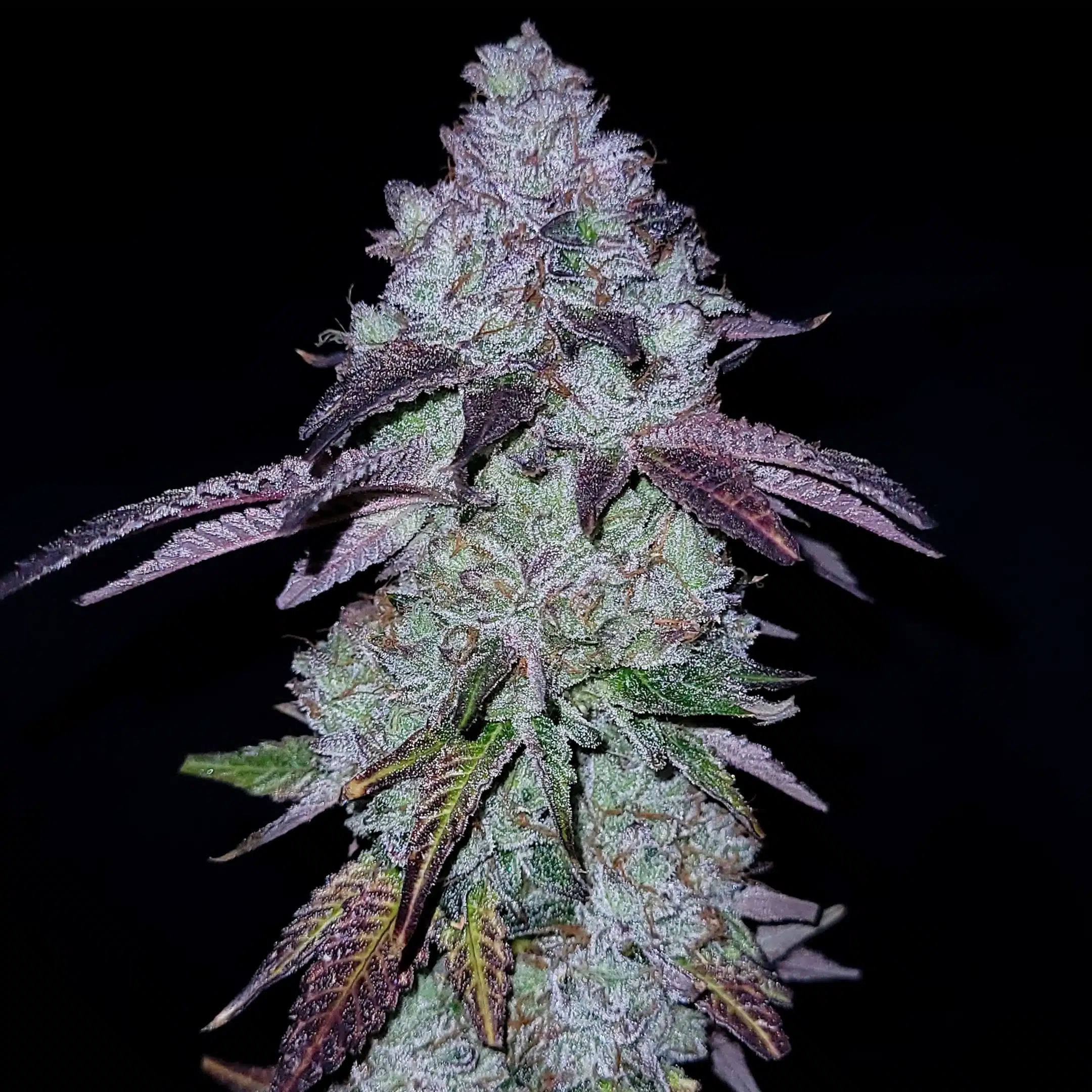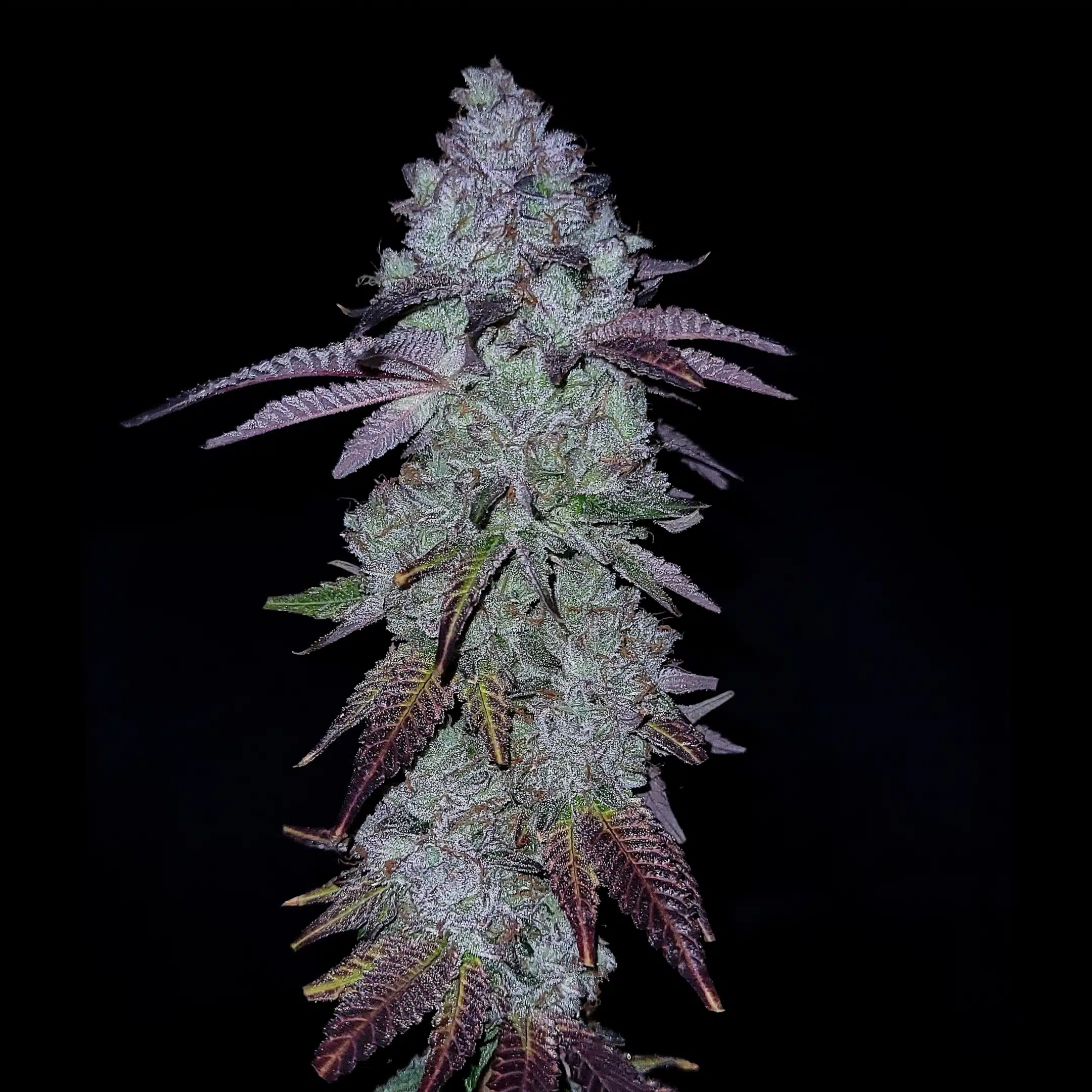 Its tight, frosty flowers are a sight to behold, boasting dense dark blue buds blanketed in trichomes.