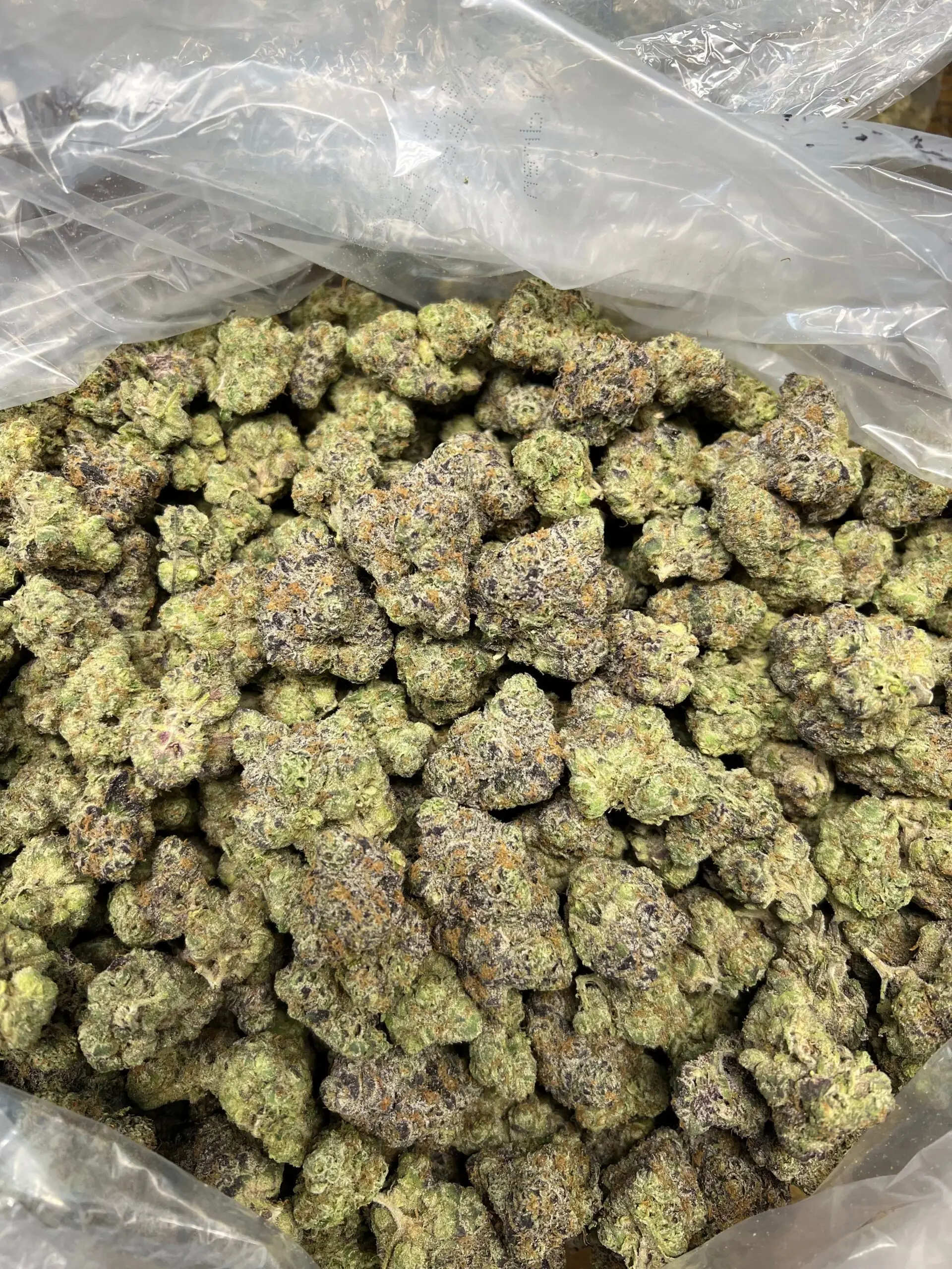 The buds are bright green with amber hairs and purple accents, covered in a sticky frost that glimmers in the light.